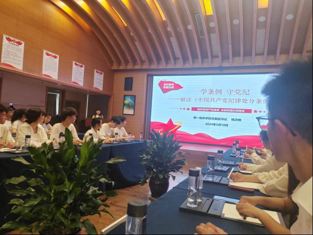 最后,珍酒公司党总支副书记刘绍恒也为党员们上了专题党课,他以“传奇酱香·红色珍酒”为题给党员们传达企业文化和企业精神,鼓励党员员工要有团队合作、交流沟通能力,这样同学们的职业生涯才会更远更高。杨洪艳开展“学条例 守纪律——解读《中国共产党纪律处分条例》专题党课”,她感谢珍酒厂为同学们打开了一扇理论联系实践的大门,鼓励同学们作为医员工要钻研深耕自己的专业领域,牢记自己的社会责任发扬工匠精神,为医疗事业添薪续力。