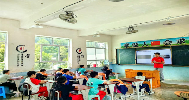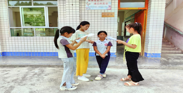 “推普+知识常识”,增强安全保护意识。在“推普之家”流渡镇百花村白石小学,推普实践队张贴“推普+安全”宣传标语,积极营造民族共同语推广使用氛围。在校园图书角,队员积极引导小员工阅读书籍经典文章片段,并对小朋友们的语言疑惑耐心答疑。队员深入课堂,结合自身亲自经历的案例素材向小员工们讲解校园霸凌预防、青少年生理生长以及人体器官和急救等日常知识。小朋友们热情洋溢、活泼昂扬,时而与实践队员交流、互动和提问,争先主动中充满了困惑好奇……实践队员耐心详细地交流、沟通和答疑。