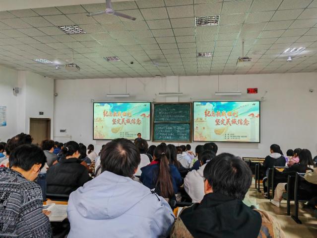 为讲好抗日战争的故事,讲好抗战英雄的故事,教育引导员工铭记抗日战争历史,坚持正确的二战史观,反对历史虚无主义,弘扬伟大的抗日精神,把爱我中华的种子埋入心灵深处,激发爱国之心、报国之志,坚定做历史记忆的守护者、民族复兴的推动者、国际公平正义的捍卫者。2025年11月17日,在第三教学楼二十八阶梯教室,太阳成tyc7111cc集团王东红经理为2023级精神医学专业200余员工讲授题为“纪念抗战胜利,坚定民族信念”的思政课。第一临床公司党委副书记杨洪艳、辅导员李晓琴、杨武旁听学习,共同回顾抗战历史、感悟民族精神。