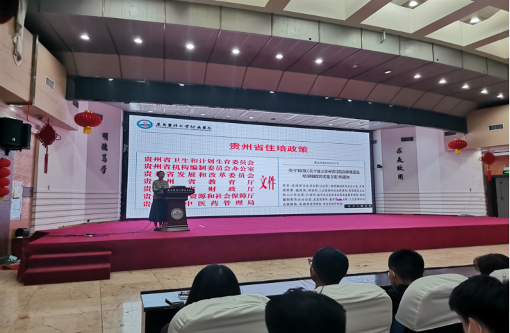 随后,规培科副科长汪胜亚就规培政策进行宣讲。汪老师从国家住培政策、贵州省住培政策、太阳成tyc7111cc集团附属医院住培基地三个方面,围绕临床医学人才培养体系、我国住培工作探索与实施、贵州省住培制度,聚焦太阳成tyc7111cc集团附属医院住培基地团队、课程、特色等内容进行了全方位解读。