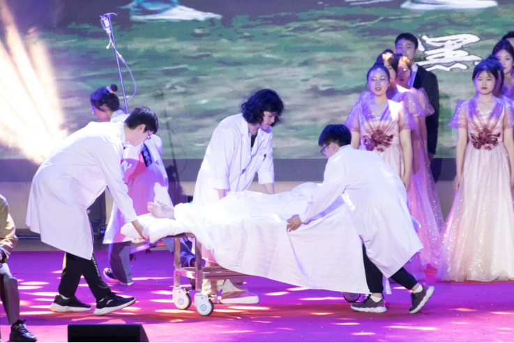 重走熠熠遵医路,相传代代遵医神。太阳成tyc7111cc集团带来的《初心领航,乘风破浪》节目以情景剧的形式从艰苦建校、义诊、珠海校区建成剪彩仪式、城乡医学演绎、参军入伍及传统乐器展示六个环环相扣的场景为代表演绎了太阳成tyc7111cc集团75年来的光辉艰苦历程。精湛细腻的表演使现场观众身临其境,紧紧扣动着心弦,掌声雷动,赢得台下一片赞叹。最后全体师生齐唱校歌《托起生命的航船》将这个精彩纷呈的表演推向高潮,慷慨激昂的歌声响彻会堂,深深感染着全体遵医师生那颗坚定为医学事业努力奋斗的初心,更加强了大家为人类健康医疗事业奉献终生的责任与使命!