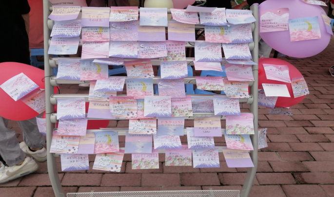 分享快乐,丢掉烦恼。5月20日11:00新蒲校区博文楼下,第一板块活动准时开始,共分为五个部分。一是放飞“烦闷”气球,将烦闷写在气球上飘动带走同学心中的焦虑和烦躁。二是“快乐传递火车”,同学们在纸上写下生活中的开心碎片,将其定格在展示板上,用文字向其他人分享快乐。三是交换祝福明信片,同学们在明信片上写下自己对陌生人的祝福,用交换的方式获得之前的同学给自己留下的祝福。在鼓励自己的同时也勉励他人。四是“卸下烦恼”,同学们将一直困扰自己的问题写在纸上然后撕毁丢入烦恼垃圾桶中,丢下纸条的同时也丢下烦恼,卸下疲惫,获得轻松和自由的自己。“没有一个拥抱该被忘记,每个拥抱都闪着动人的秘密”。在活动最后,同学们拥抱着熟悉的同学,在拥抱中传递温情,在拥抱中重拾信心,在拥抱中重新成为自己情绪的管理者。