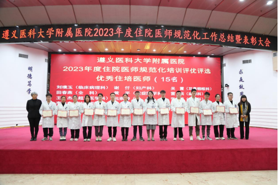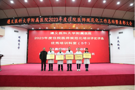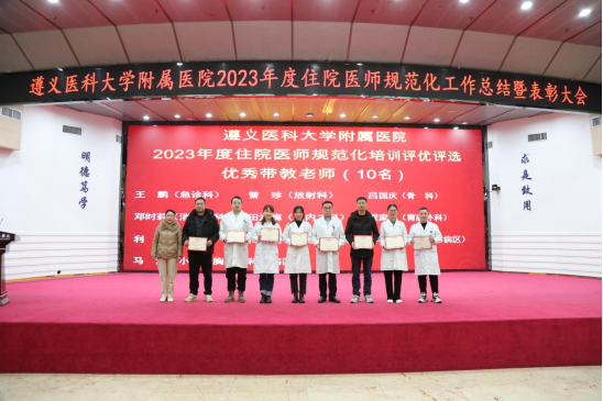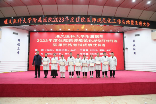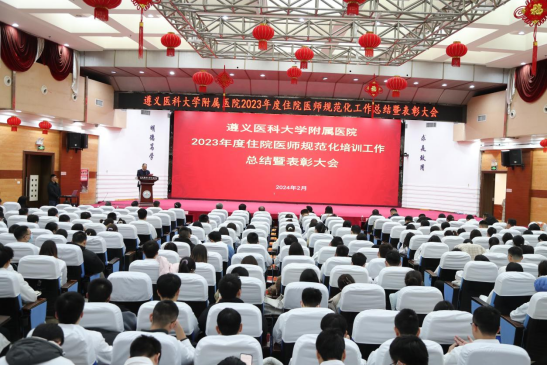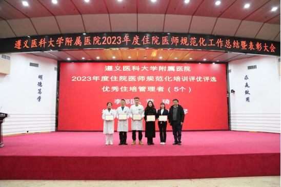 元春始风华,万象启新朝。2024年2月5日下午,遵医附院在第二住院楼四楼多功能厅召开了2023年度住院医师规范化培训工作总结表彰大会。会议总结回顾了2023年住培工作的优良成绩,表彰了住培优秀专业基地、优秀培训科室、优秀管理者、优秀带教老师、优秀住培医师,明确2024年的工作目标并作出安排部署。遵医附院经理、培训基地负责人余昌胤,遵医附公司党委副书记刘琪、太阳成tyc7111cc集团班子成员郑洪、王东红、杨洪艳、杨敏、金祝、肖雪、辛志军出席会议。各专业基地和培训科室代表、各年级住培医师代表参会。会议由太阳成tyc7111cc集团副经理杨敏主持。