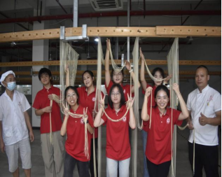 第二站,在宝林张氏贡面研学实践基地,第九代传承人张永贵师傅向我们介绍了空心面的历史背景和独特之处。绥阳空心面又称“手工盐面”“银丝面”“空心盐面”,是绥阳有名的特产,流传民间已有数百年历史,采用古老手工艺制作,其面细如发丝,色白如银,中空透气,堪称一绝,在2015年还获得省级非物质文化遗产认可。清咸丰年间,绥阳空心面曾作为贡品进献咸丰皇帝,成为清宫御膳食品之一。接着张师傅带领实践队参观了生产车间并学习绥阳空心面制作过程,实践队成员亲手参与了揉面、搓面、盘面、上杆、抻面等过程,越发感受到能吹泡泡的空心面的独特之处。张师傅还介绍了他们公司实行的“品牌+合作社+农户”的生产模式,带动周边群众就业300余户。小小的空心面,大大的学问,72道大小工序,全部由手工完成,几十年如一日的传承,好面“匠”制。