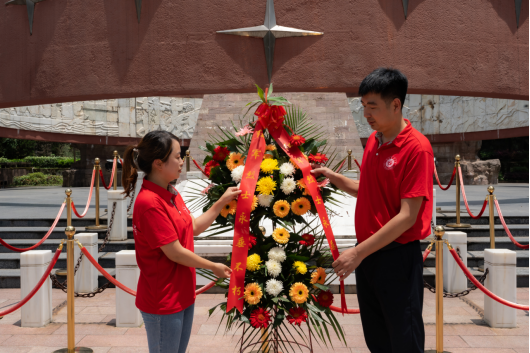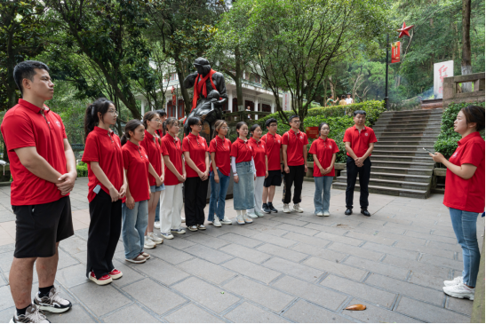 寻访红色圣地,探忆峥嵘岁月在遵义会议会址纪念馆、苟坝会议会址等地,实践队员深入学习党的光辉历史,踏寻红色足迹、追溯红色记忆、挖掘红色故事,并对现场游客进行了访谈;在凤凰山红军烈士陵园,实践队员在烈士纪念碑前敬献了花篮、集体默哀、重温入团誓词并绕行纪念碑一周,表达对革命先烈的崇高敬意以及青年学子不忘初心、勇担使命的坚定信念;在革命先烈龙思泉雕塑前,带队老师田源为实践队员介绍了红军长征的历史以及邓萍、龙思泉等先烈的事迹;在苟坝会议会址,全体实践队员深情朗诵了《七律·长征》,深刻感受中国工农红军大无畏的革命精神和英勇豪迈的气概。