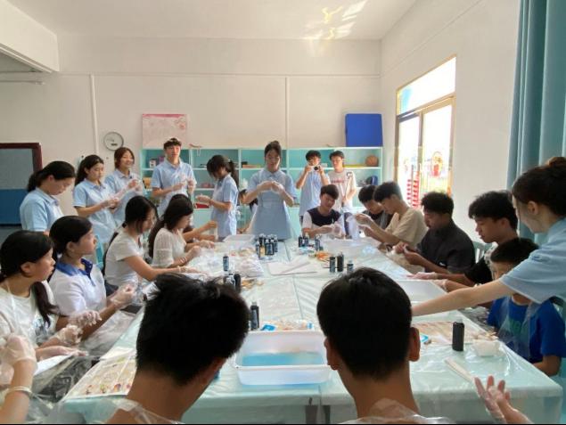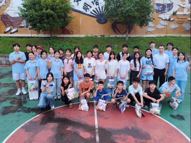 在一周的时间里,团队成员通过开展手工扎染活动,让孩子们沉浸式感受我国非物质文化遗产的魅力;针对乡村未成年人可能存在的自卑、困惑等心理问题,成员设计了抓手指、桃花朵朵开、踩气球、接力赛等心理小游戏让大家释放心理压力。游戏后,志愿者与个别表现出心理困扰的青少年单独交流,给予安慰和引导,帮助他们走出青春困惑、树立积极心态;文艺汇演上,“校十佳歌手”入围成员王希宇程为孩子们带来一首《稻香》,团队其他成员精心准备的表演也穿插其中,现场所有人手拉着手合唱《小美满》,夕阳下,孩子们眼里透着亮光,是喜悦,也是对未来的憧憬;活动最后,团队向孩子们发放了捐赠的零食礼包、文具、图书等物资,以此鼓励他们好好学习、保持乐观。