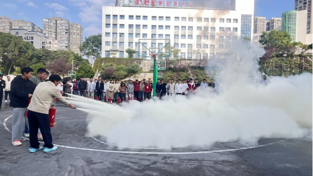 讲座结束后,在篮球场开展了消防灭火实战演练。师生们在医院保卫处消防科专业人员的的指导下,亲自体验了灭火器、消防栓等消防器材的使用,掌握了正确的灭火方法。师生参与热情高涨,现场过程紧张有序,达到了预期效果。