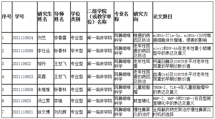 2022年耳鼻咽喉科学硕士研究生学位论文开题公告